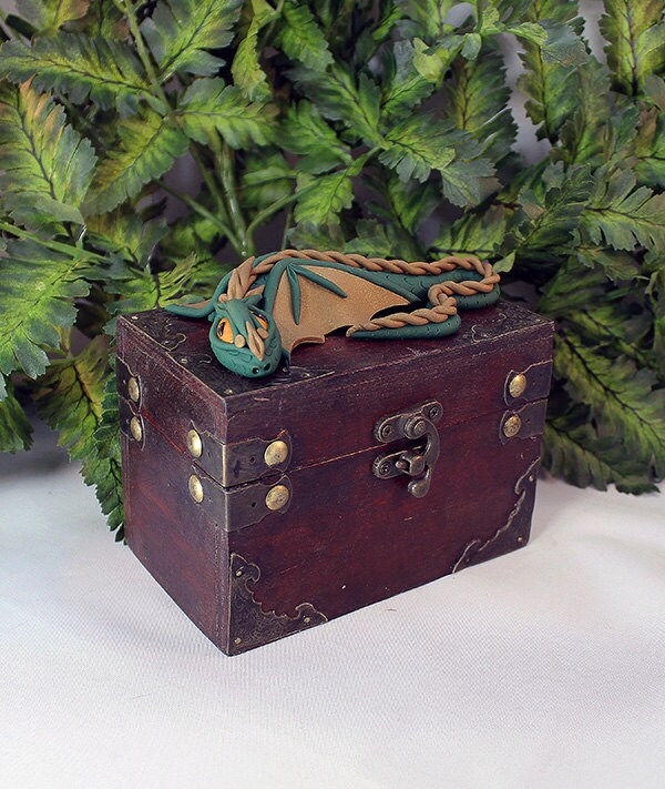The dragon is hand sculpted by me of polymer clay and has been attached to the chest with epoxy. The treasure chest measures 5.5 inches x 3 1/8 inches x 3 7/8 inches tall (with the dragon the height is approximately 4.5 inches).